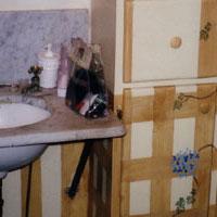Plaid Glaze - Philadelphia, PA A furniture stain was mixed with oil paint to decorate this vanity with a plaid effect. Then, stylized hydrangea were painted on top. For a close-up, click here. |